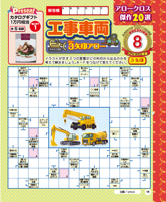 アロークロスは一般的なクロスワードパズルと違い、マスの中に「ヒント」が埋め込まれています。また、イラストや写真などが入った「大マス」の存在も、このパズルを解くための大きなヒントとなっています。大マスの写真やイラストを手がかりに、マスを埋める言葉を推理しましょう。