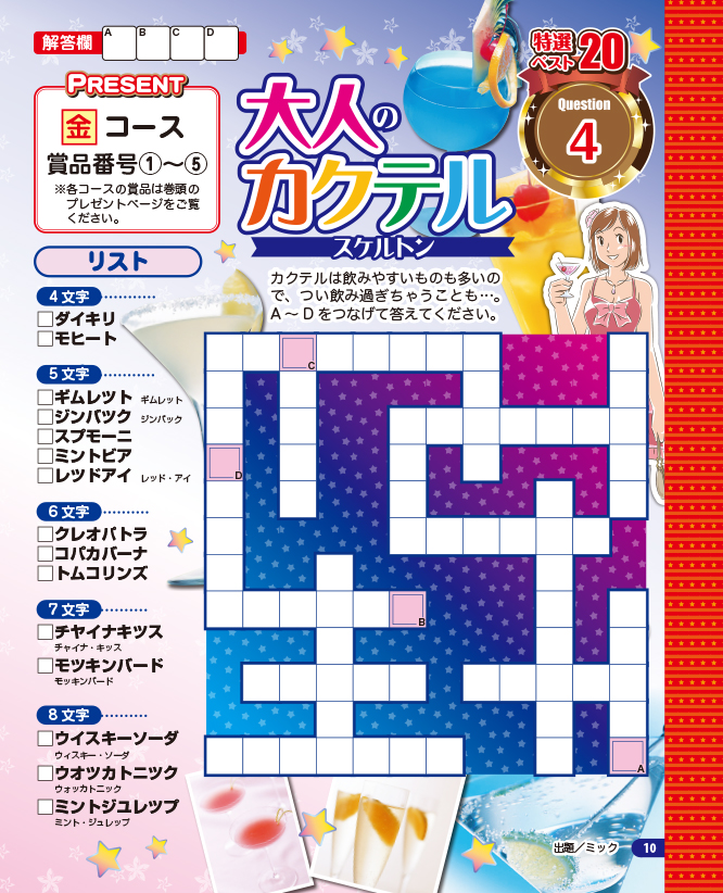 問題のサイズが大きくなるとマスの数もキーワードの数も格段に多くなるため、難易度がグッと上がります。手応えのある難問に挑戦したい方にオススメの、超特大ジャンボアロークロスとスケルトンを計2問収録しました。難易度が高いだけに、解けた時の達成感もひとしおです。