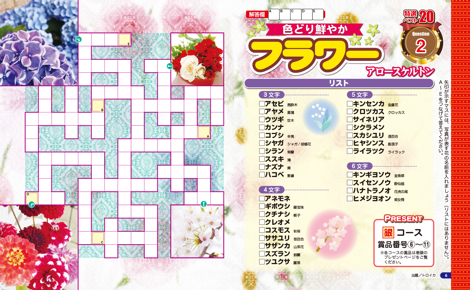 矢印(アロー)に沿ってキーワードを書き込む「アロークロス」。クロスワードに似ていますが、マスを埋める「カギ」がパズル盤面の中にあるのが特徴です。矢印が出ているマスの中には文字やイラストなどさまざまなヒントが入っており、バラエティに富んだ問題が用意されています。
