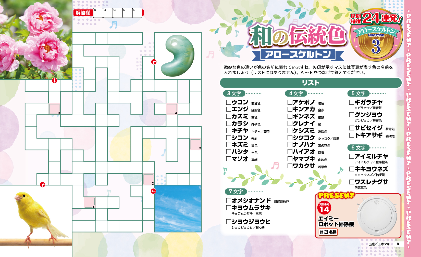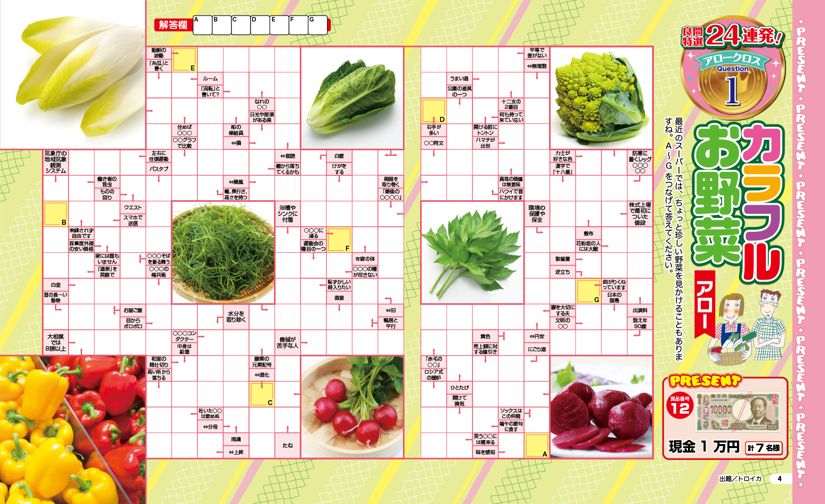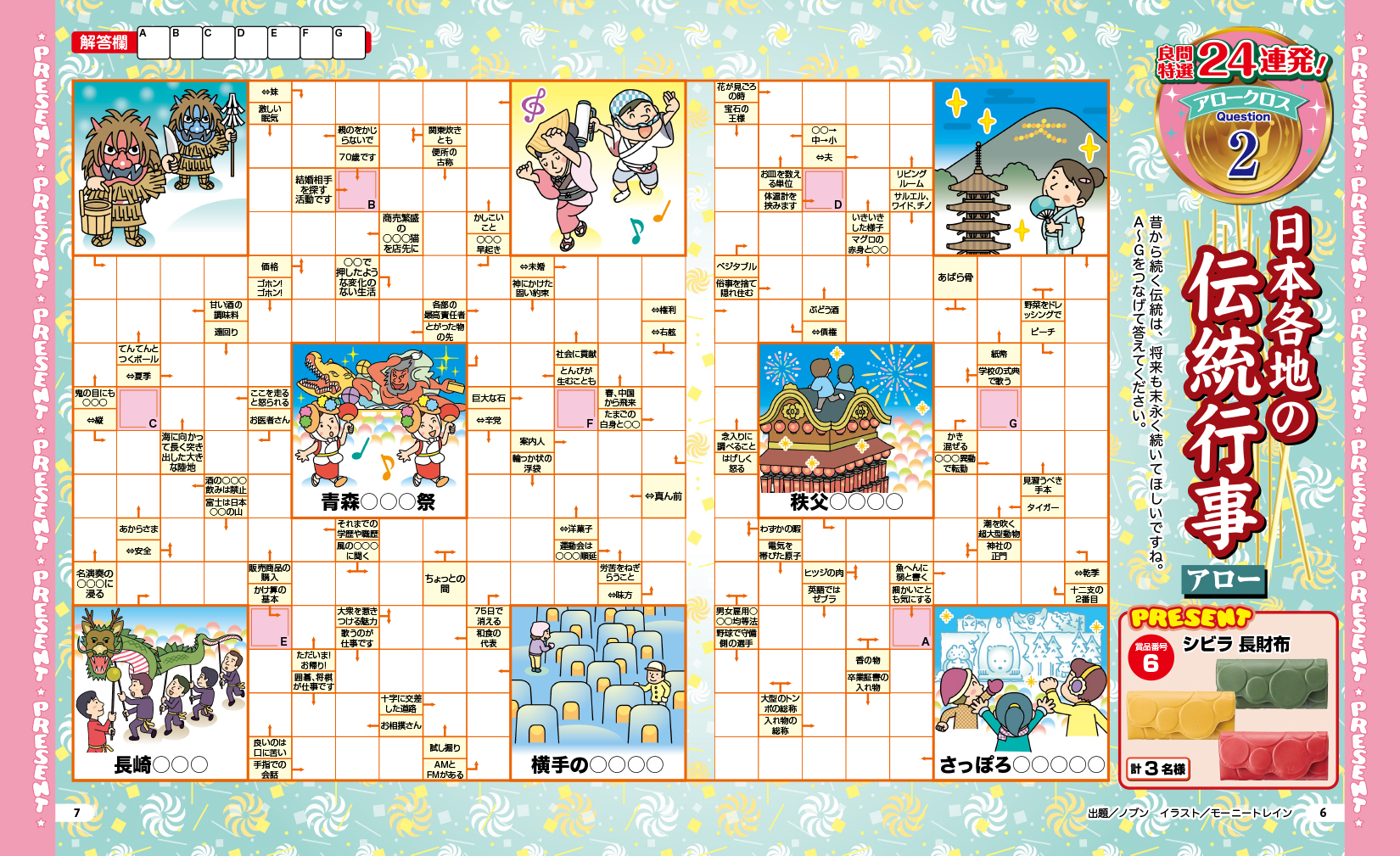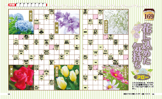 ●大マスに入っている画像をヒントにして問題を解いてみましょう。中には難読漢字やてんつなぎなど、ほかのパズルと合体したアロークロスもありますよ。