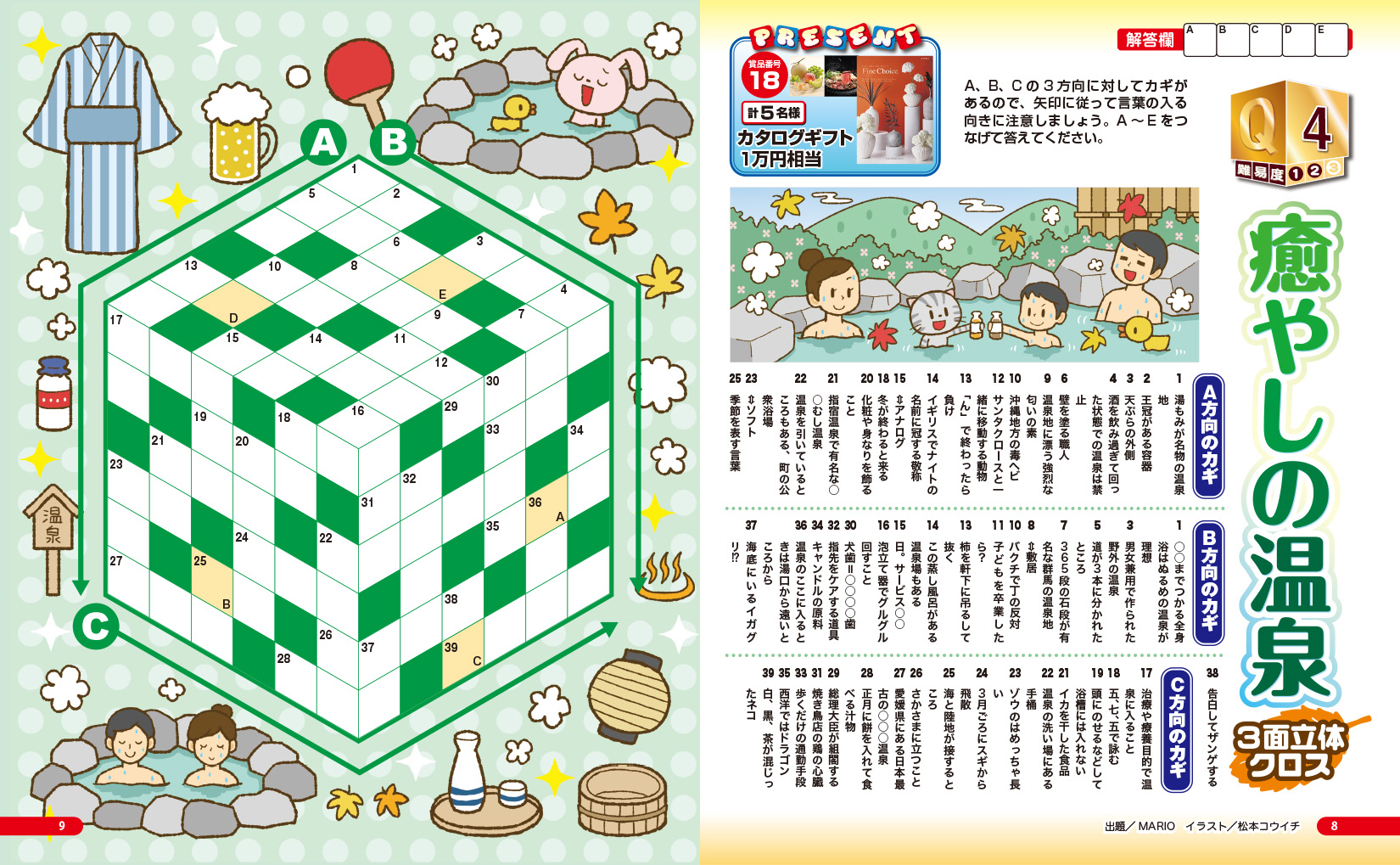 「クロスワード」とひと言で言っても、実はたくさんの種類があるんです。漢字とカギで言葉ひらめく「漢字MIXクロス」、リズミカルな五・七・五のヒント「川柳クロス」、楽しさ飛び出す立体感「3面立体クロス」など。ユニークで魅力的なクロスワードの世界を本誌でお楽しみください。