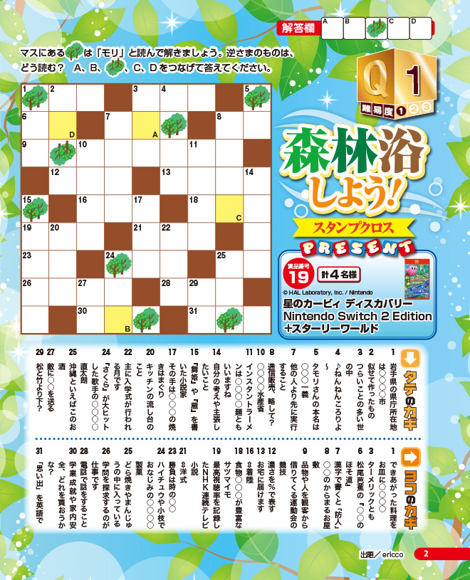 ●緑に囲まれると癒されます!「森林浴」をテーマにしたクロスワードです。