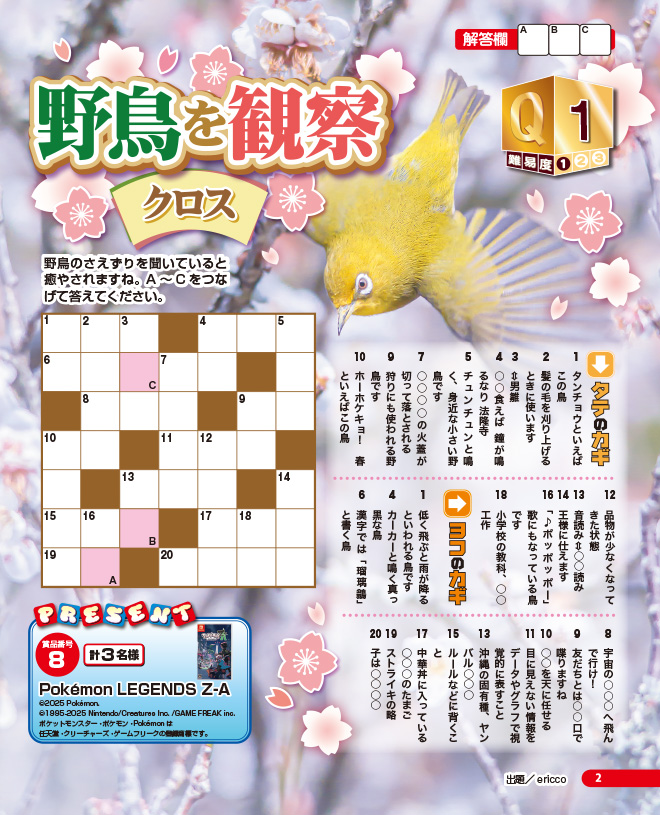 ●さえずりが春の訪れを教えてくれます!「野鳥」をテーマにしたクロスワードです。