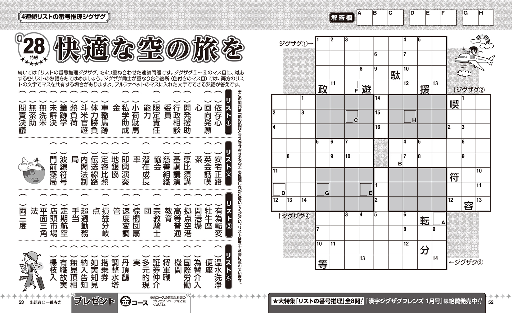 マスの総数、熟語のリスト数が圧倒的に多い「超特大(スーパージャンボ)ジグザグ」を楽しめるのも本誌の特徴です。どの問題も難しく、解き応えのある問題ばかりなので、無理をせずにゆっくりと時間をかけて解いてみてください。