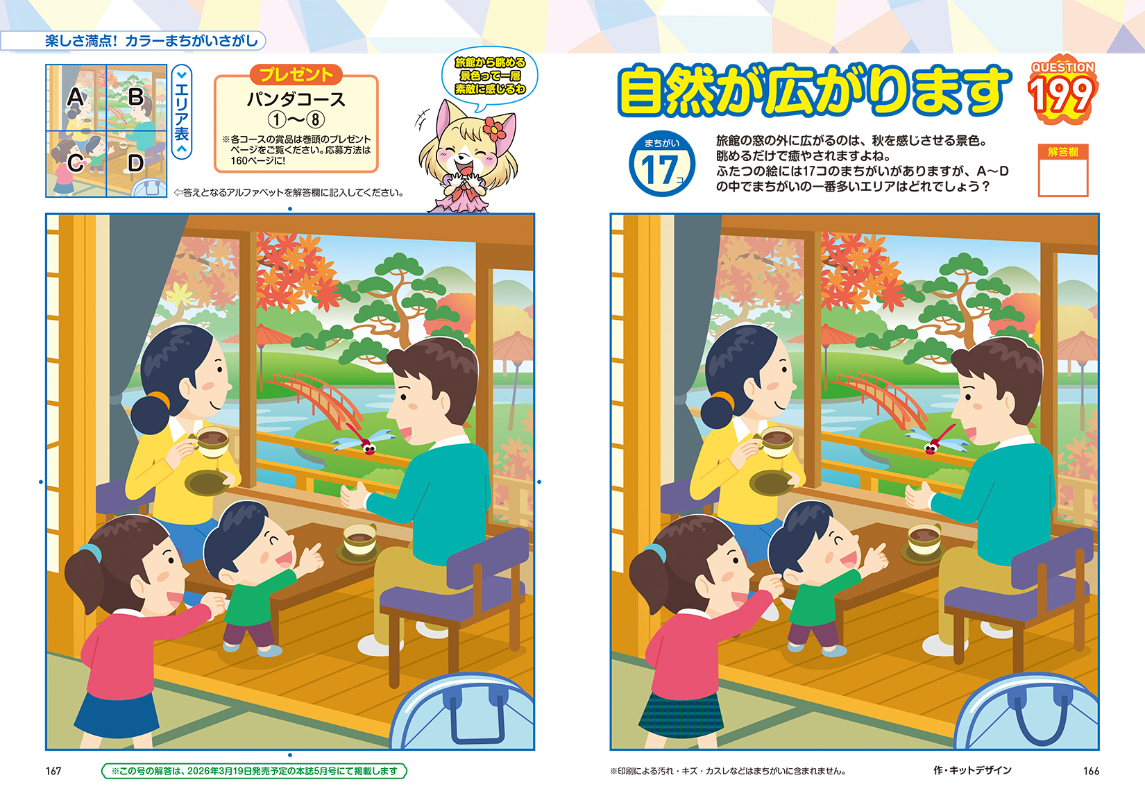 ●正方形、タテ長(ヨコ長)の長方形、ヨコ長のパノラマワイドなど問題のサイズも多様です。イラストのタッチやアングルが変わったり、まちがいの数、対象エリアの数も問題によって変わるなど、解きあきない仕掛け、仕様となっています。