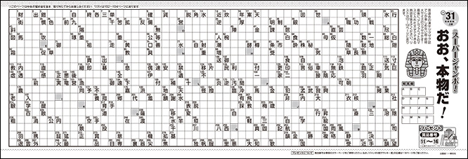 本誌はマスの総数、熟語のリスト数が圧倒的に多い4ページで1問の「超特大(スーパージャンボ)ジグザグ」を楽しめるのも特徴です。ジャンボ問題はどれも難しく、解き応えのあるものばかりなので、無理をせずにゆっくりと時間をかけて解いてみてください。