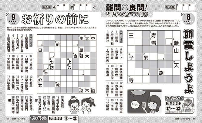 ●1番人気の「いじわる色マスジグザグ」は、リストの熟語の一部が色マスにより隠されており、その位置を考えながら一文字ずつ文字を埋めていきます。推理力や集中力を要しますが、粘り強く文字を埋めていき、問題を解き進めましょう。