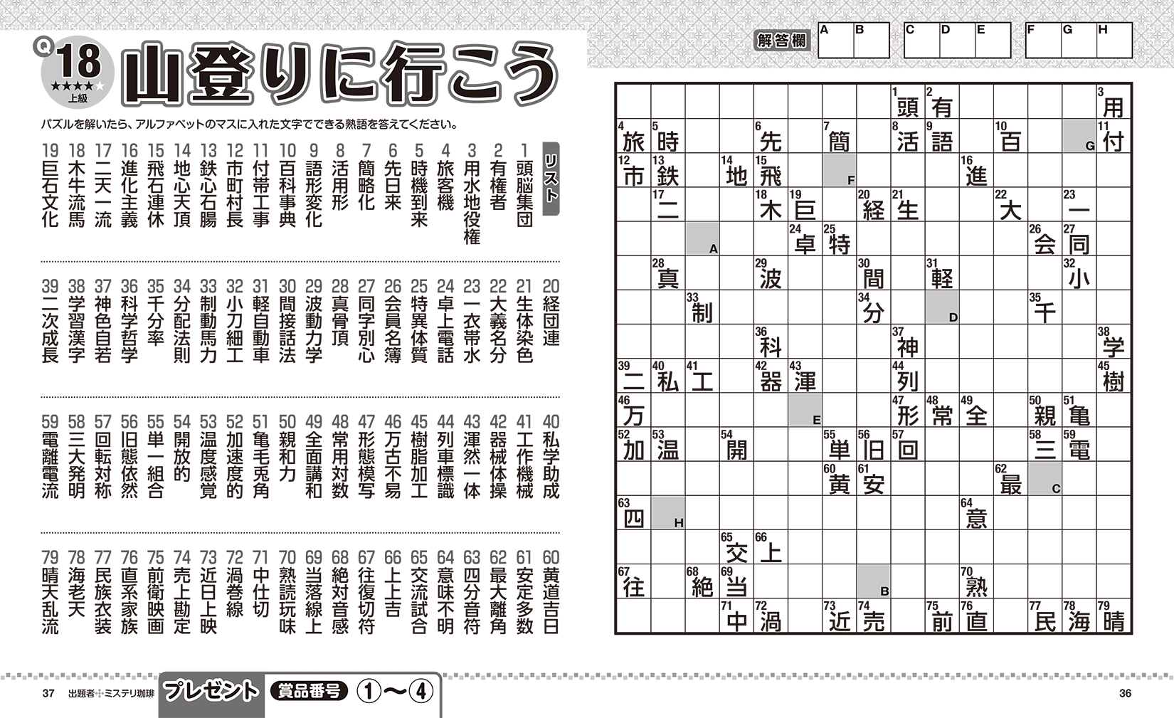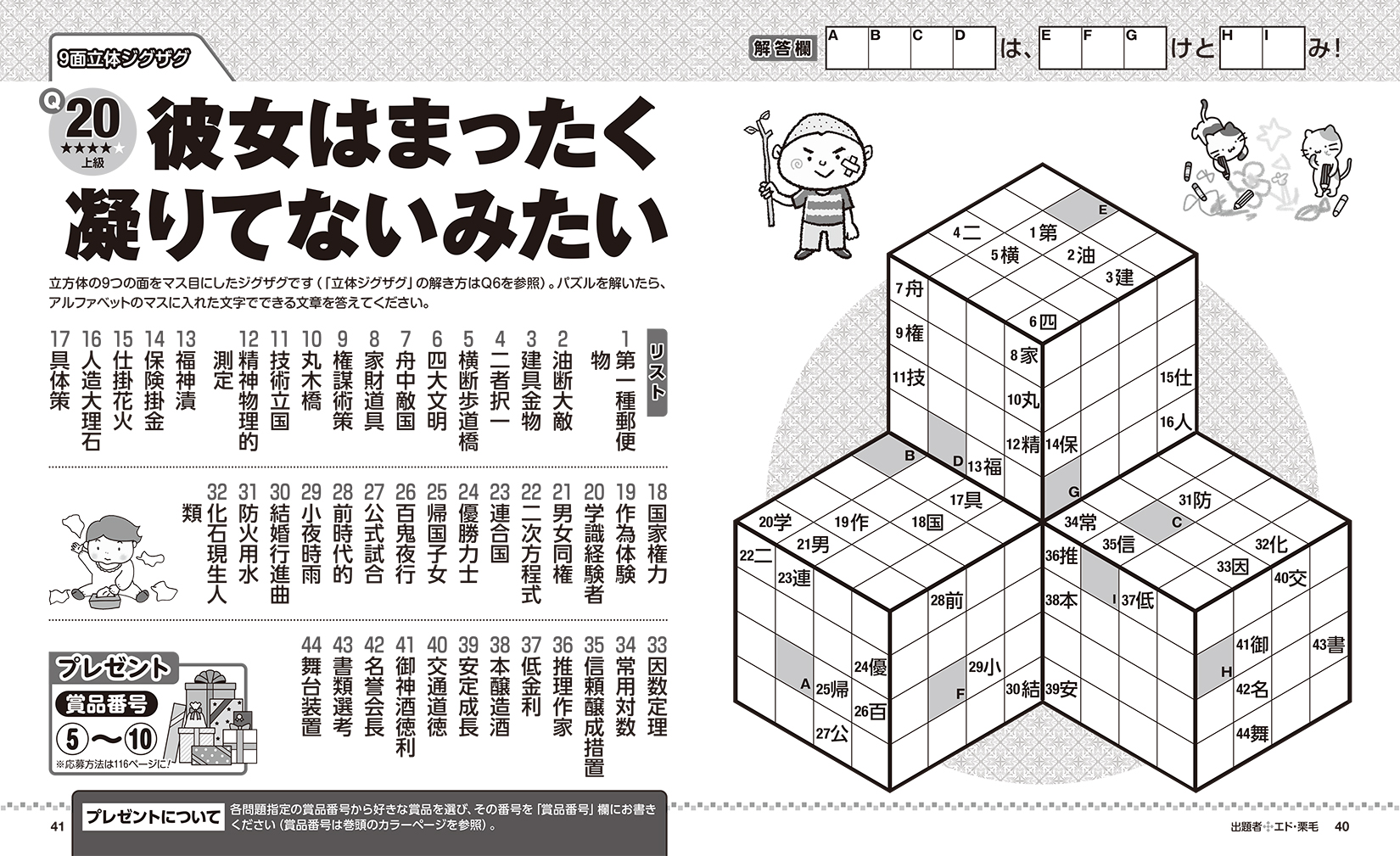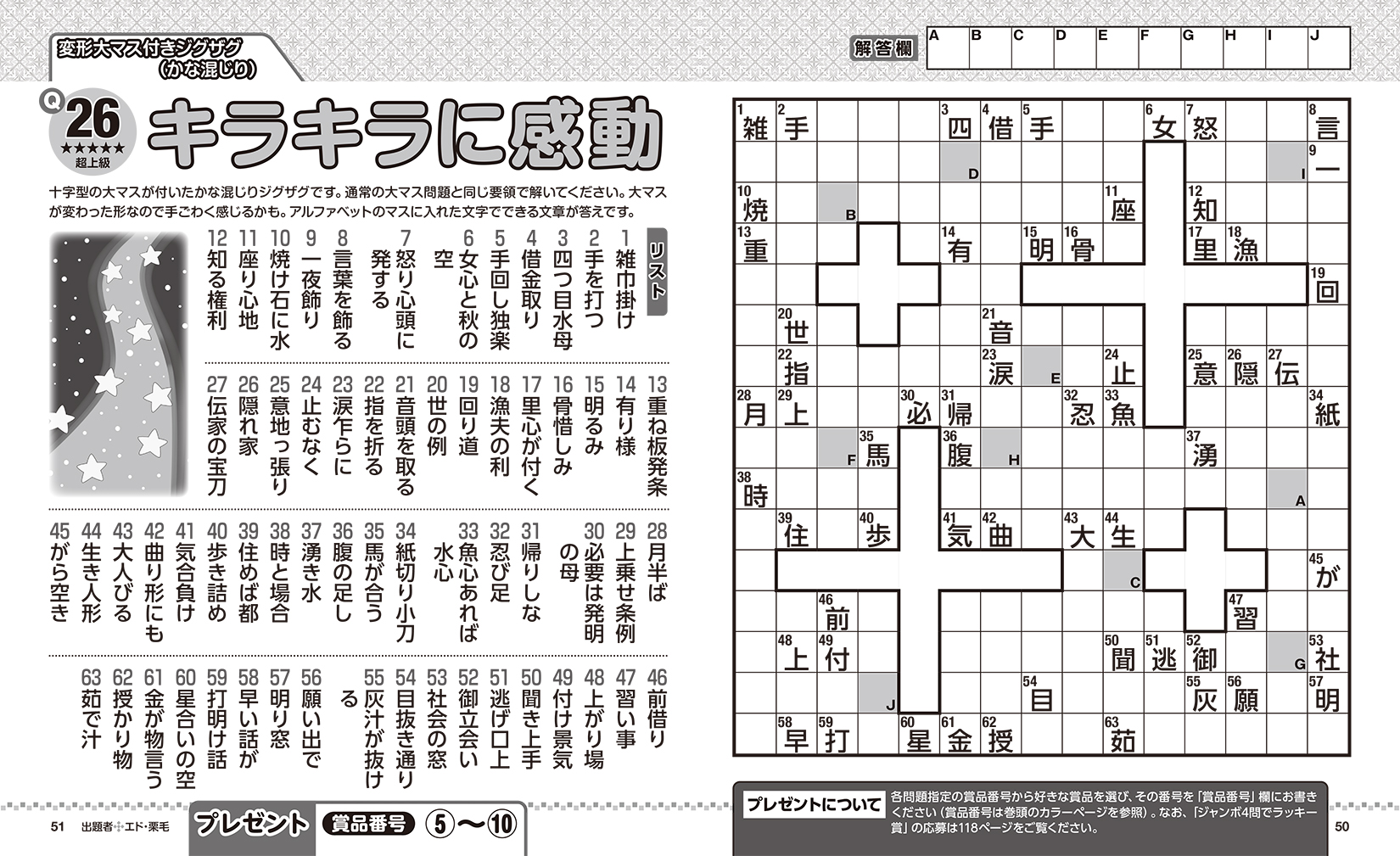 本誌はマスの総数、熟語のリスト数が圧倒的に多い4ページで1問の「超特大(スーパージャンボ)ジグザグ」を楽しめるのも特徴です。ジャンボ問題はどれも難しく、解き応えのあるものばかりなので、無理をせずにゆっくりと時間をかけて解いてみてください。