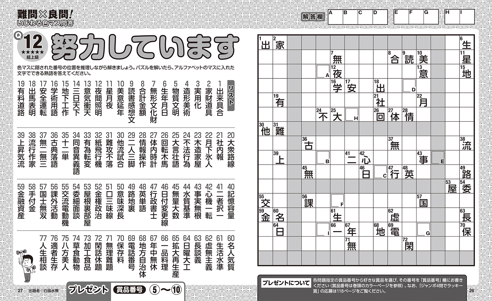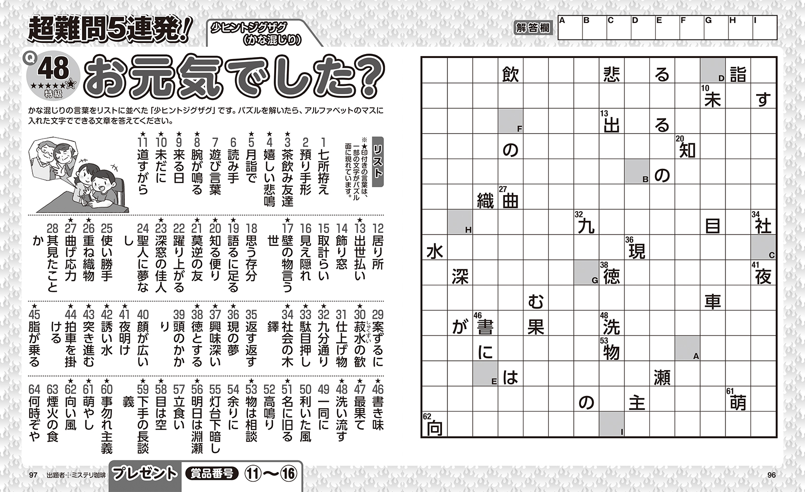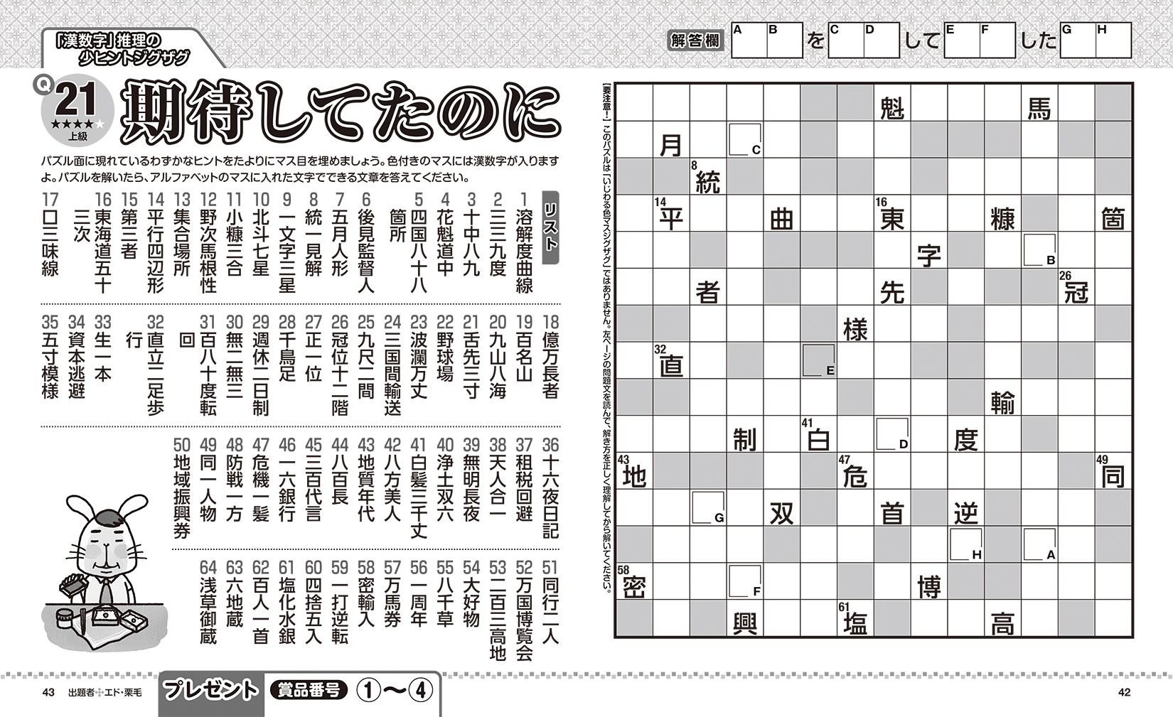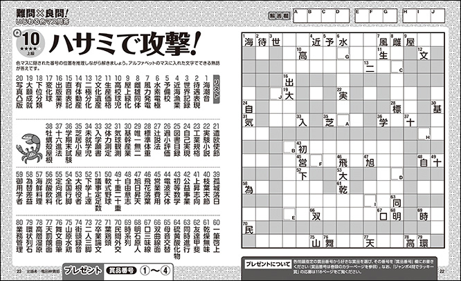本誌はマスの総数、熟語のリスト数が圧倒的に多い4ページで1問の「超特大(スーパージャンボ)ジグザグ」を楽しめます。全5問のジャンボ問題はどれも難しくて解き応えのあるものばかりなので、無理をせずにゆっくりと時間をかけて解いてみてください。