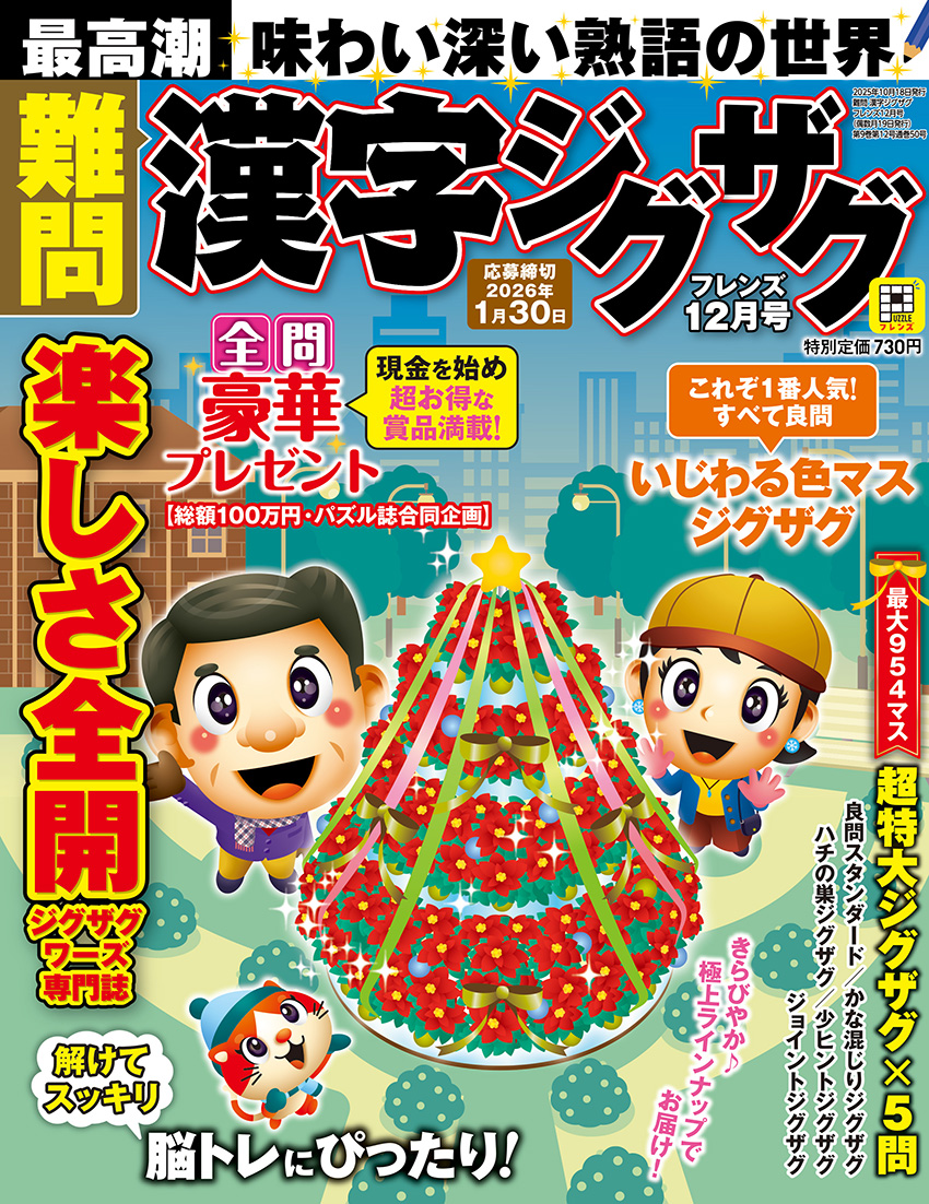 本誌では、マスの総数950(4ページ分の大ボリューム)を誇る超特大ジャンボサイズのジグザグワーズを、なんと計4問収録。 本誌でしか体験できない解き応え満点の問題を、ぜひともお楽しみください。