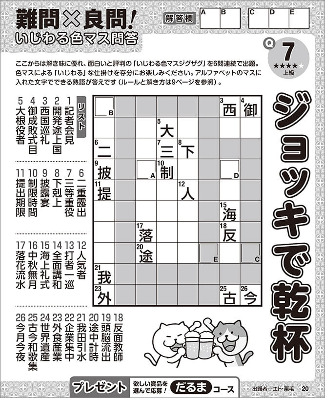通常の漢字ジグザグより盤面も熟語数もボリュームアップした、超特大サイズのジグザグワーズをなんと計5問も収録。 ただ大きいだけでなく、ハチの巣やいじわる色マスなどジグザグのバリエーションも豊富です。本誌でしか味わえない解き味満点の難問に、ぜひとも挑戦してみてください。