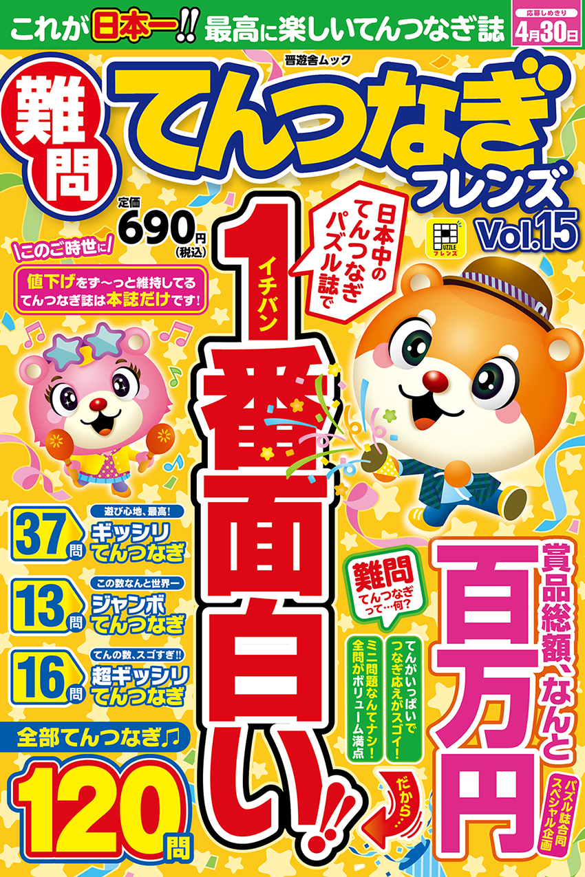 本誌に収録しているのは、2ページサイズのジャンボ問題や、1ページでもてんがたっぷり詰まったギッシリ問題など、解いて楽しい良問ばかり。「難問=解き終えるまでの手応えがスゴイ」てんつなぎがこんなにたくさん遊べるのは、「難問てんつなぎフレンズ」だけです!