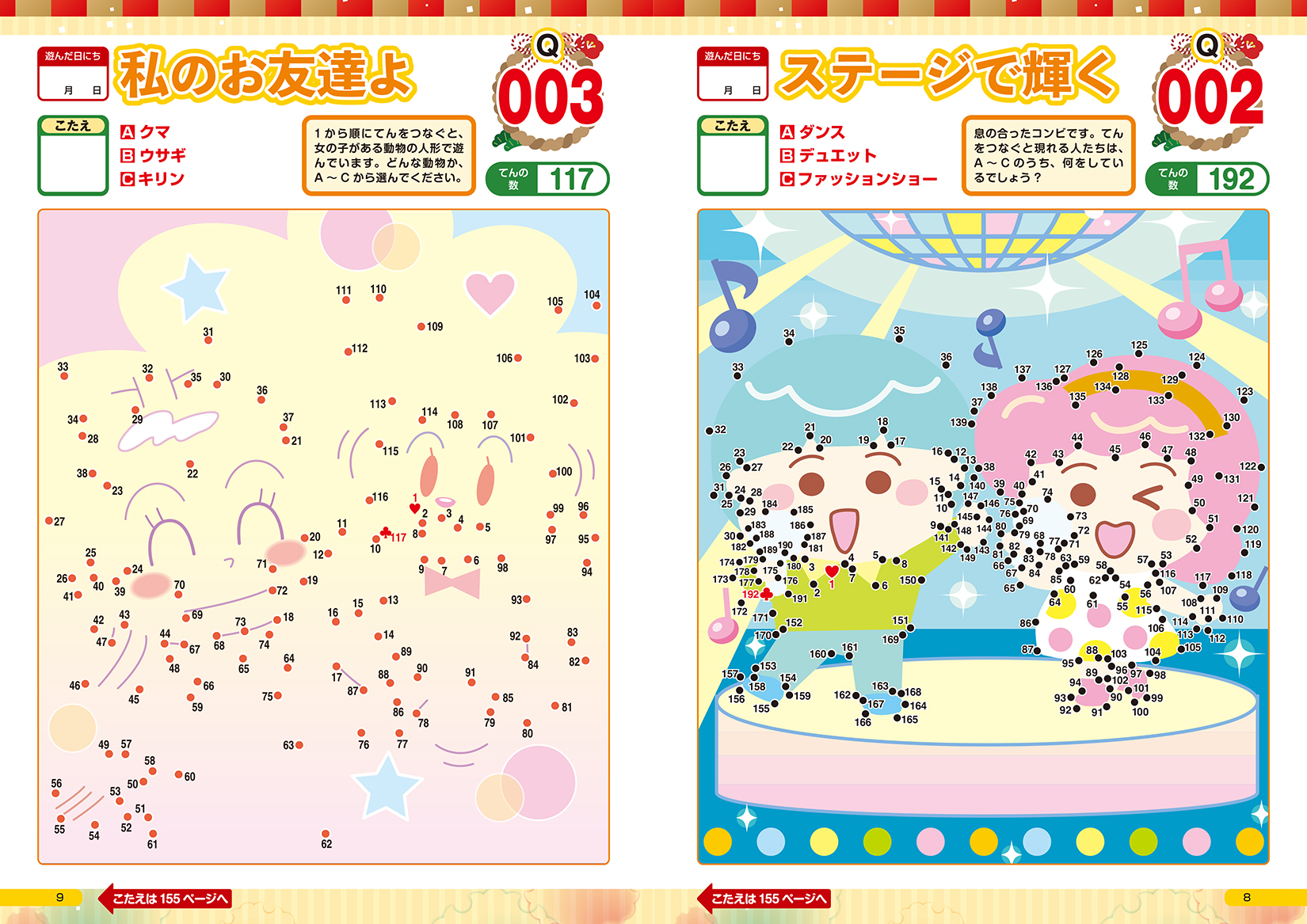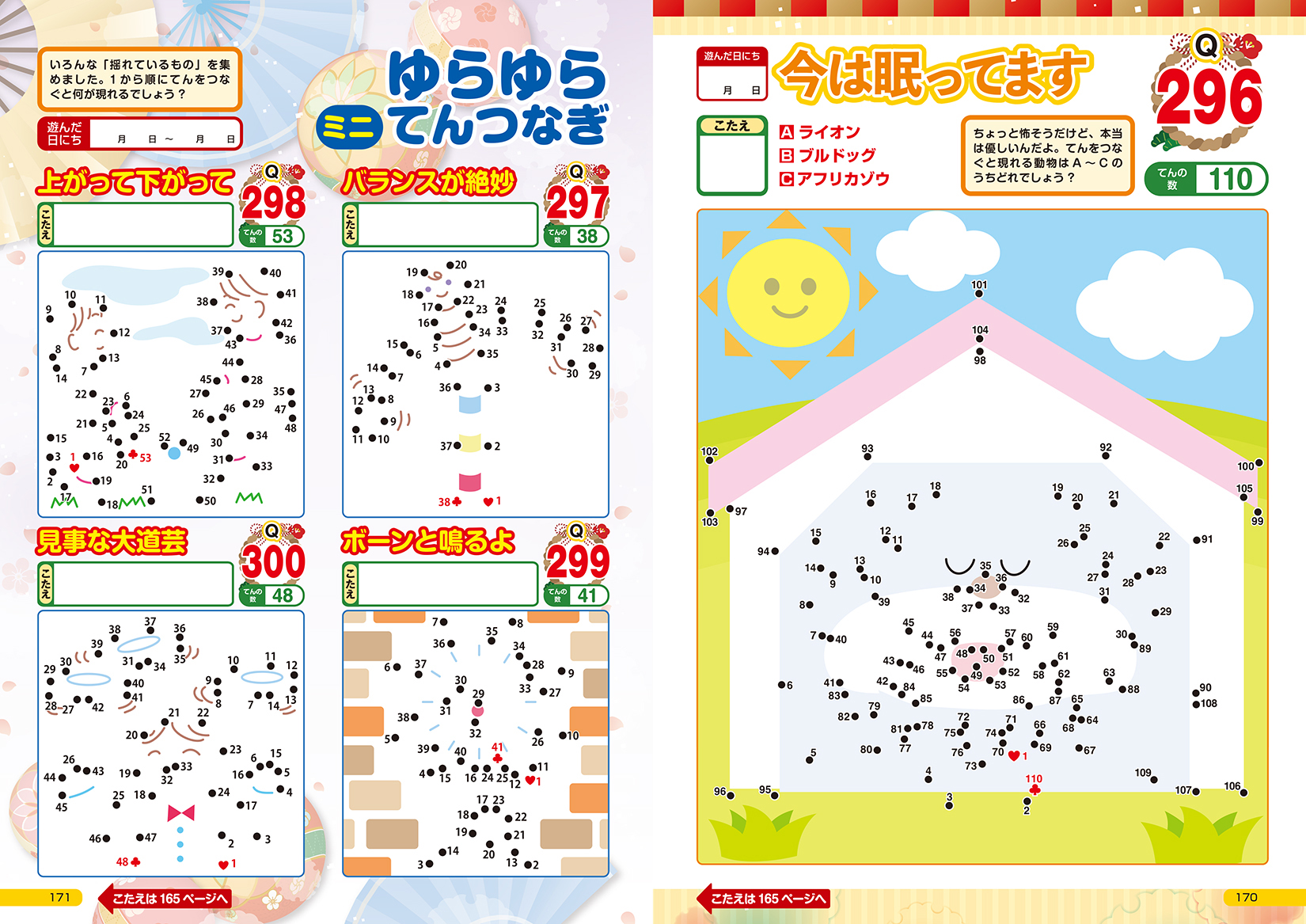 かわいい動物や楽しい童話、世界の絶景や懐かしの風景まで、てんをつなぐと現れるイラストも多種多彩。遊んだ日にちを記入する欄も用意されていますので、毎日ちょっとずつ解いていくのも楽しいですね。