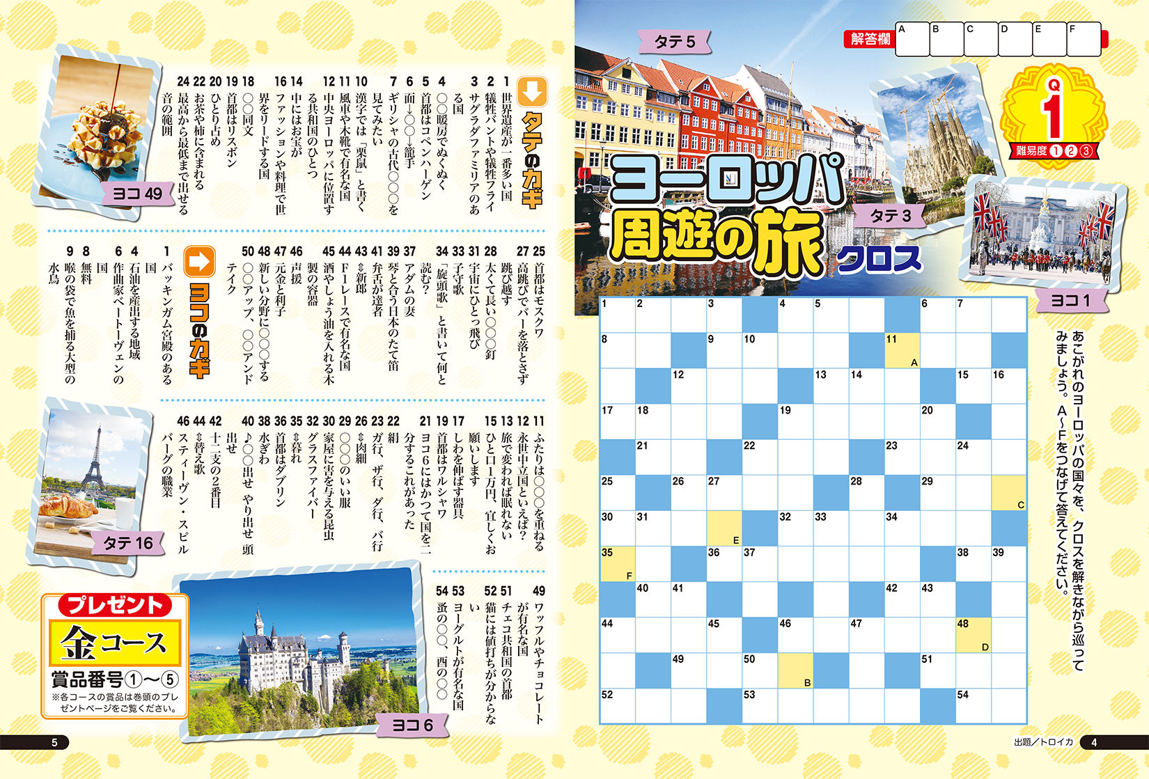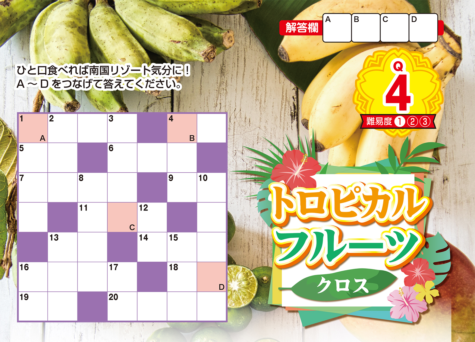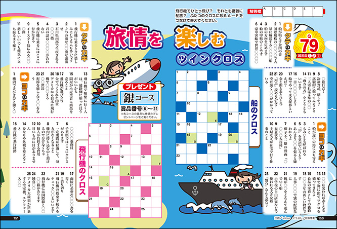 キーワード(タテのカギ・ヨコのカギの答え)をマス目に埋め、最終的に文章や言葉などを導きだすのがクロスワードの基本的な解き方となります。マスの数が多いものや盤面がタテ長のもの、ふたつのテーマでひとつの問題となるもの、「矢印」にそって解答を記入するものなど、種類も豊富です。長く遊べるので是非、挑戦してみてください。