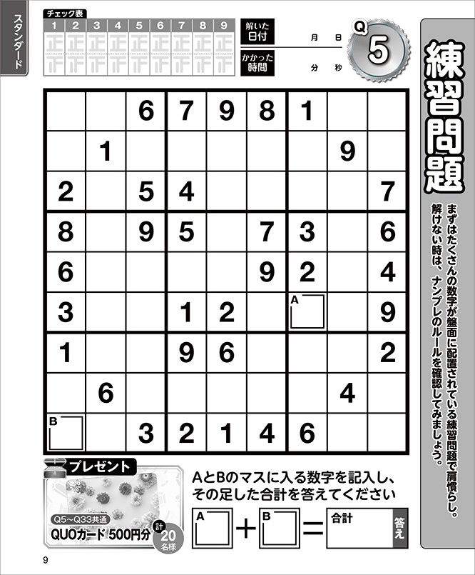 最初から盤面に入っているヒント数字が多い「練習問題」も収録。ルールを理解すれば解ける、やさしい問題からチャレンジしてみてくださいね。