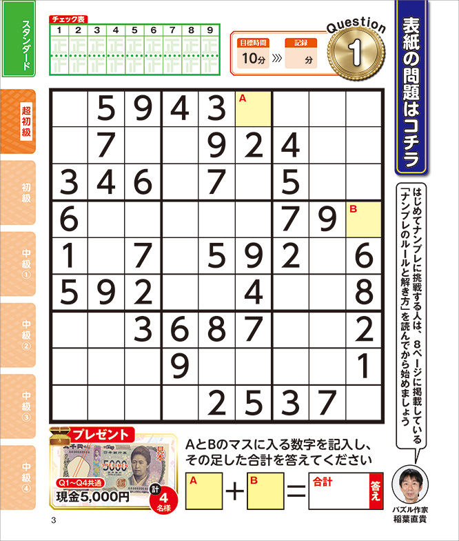マスの中にメモしやすいように、盤面を最大限までめいっぱい大きくしました。また、盤面左上にある「チェック表」が大きいことも特徴です。盤面に入った数字の数を「正」の字でもメモすることで、どの数字がいくつ盤面にあるかが分かるので解きやすくなります。