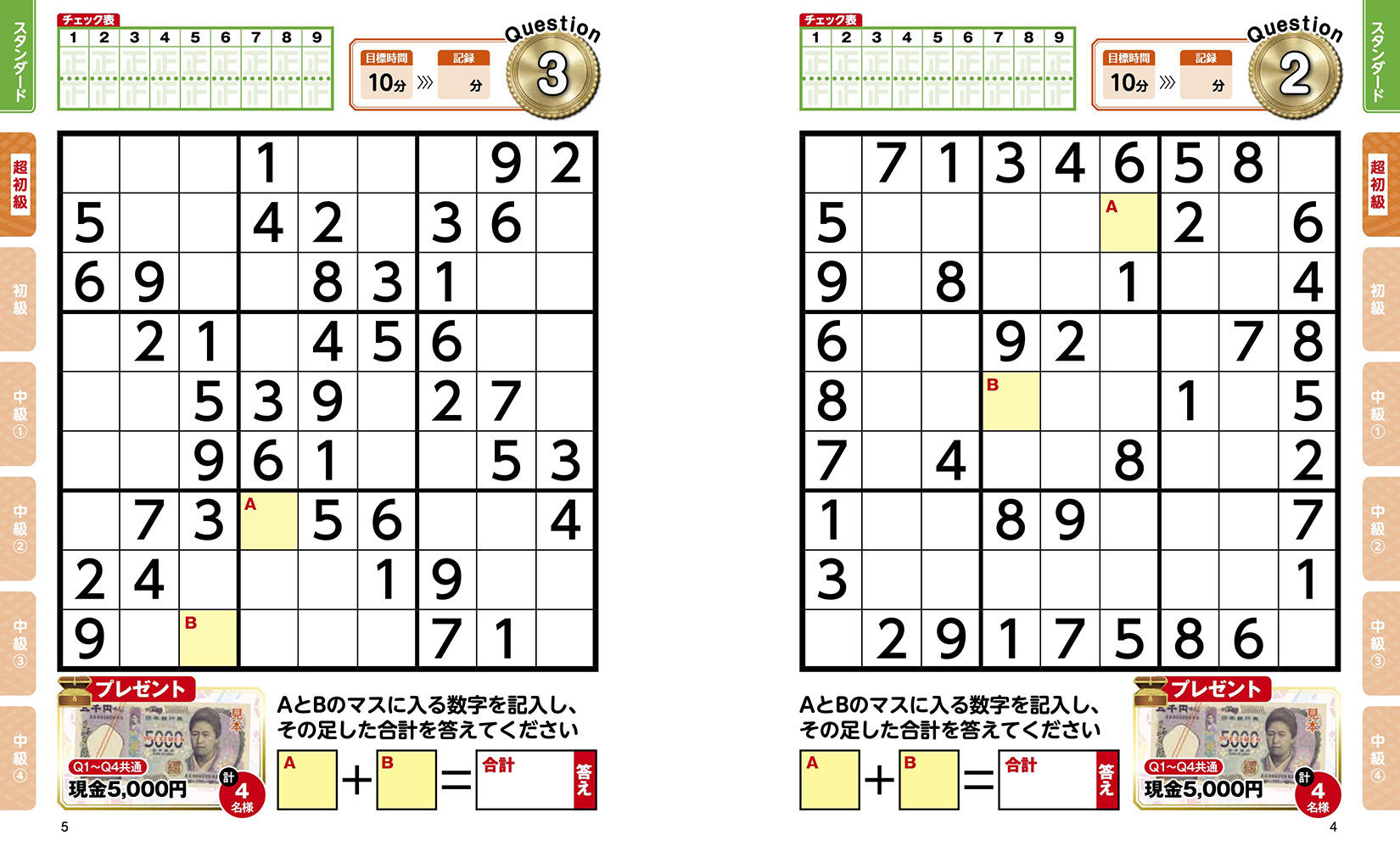 マスの中にメモしやすいように、盤面を最大限までめいっぱい大きくしました。また、盤面左上にある「チェック表」が大きいことも特徴です。盤面に入った数字の数を「正」の字でもメモすることで、どの数字がいくつ盤面にあるかが分かるので解きやすくなります。