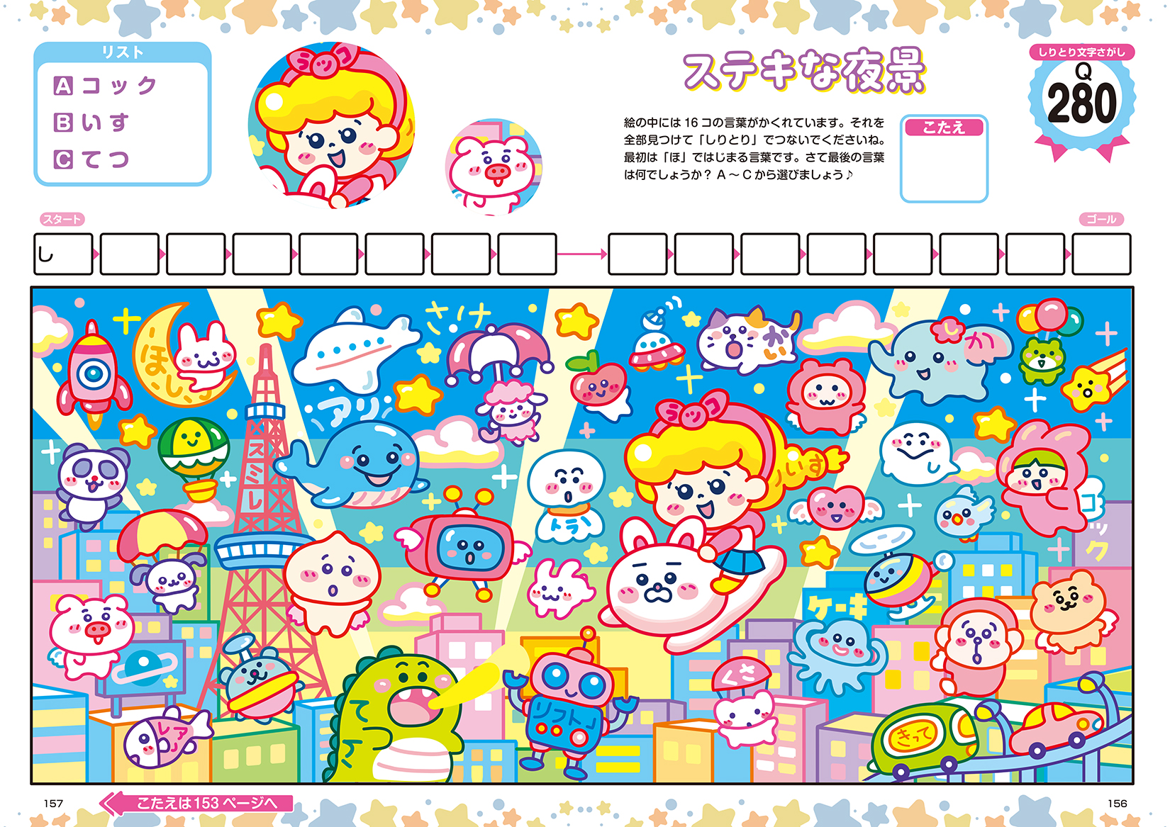 数字の順にてんをつなぐとイラストが現れる「てんつなぎ」はもちろん、2枚のイラストから違う箇所をみつける「まちがいさがし」や「イラスト迷路」、「しりとり文字さがし」など、いろんなパズルが遊べちゃいます。