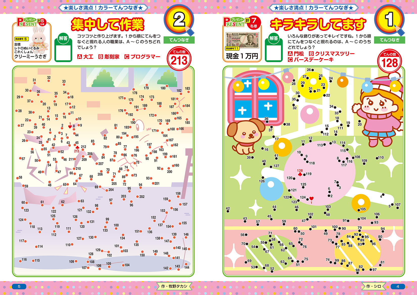 ●「1」から順にてんをつなぐと、わくわくするような楽しいイラストが出てきます。てんと数字が大きくて見やすいので、どなたでも気軽に遊んでいただけますよ。