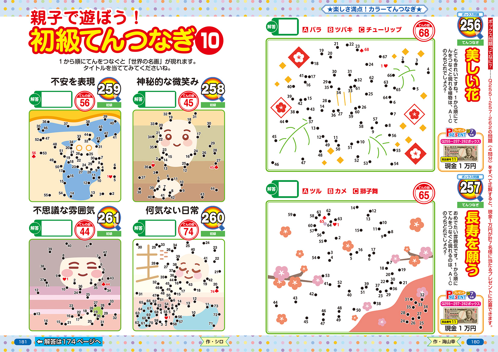 てんをつなぐと現れるのは、かわいい動物たちや、子どもの頃を思い出すいろいろな遊び、さまざまな職業、懐かしい昭和の有名人など、バラエティ豊かな傑作ばかりです。てんをつなぐだけでステキなイラストが現れますので、ぜひ挑戦してみてくださいね。