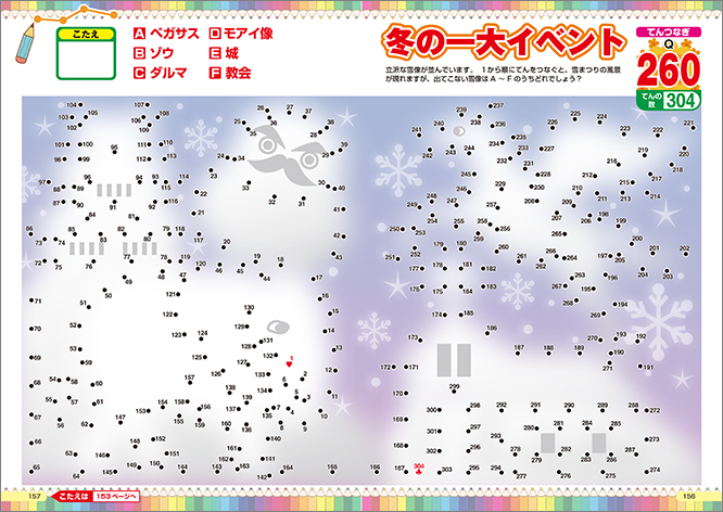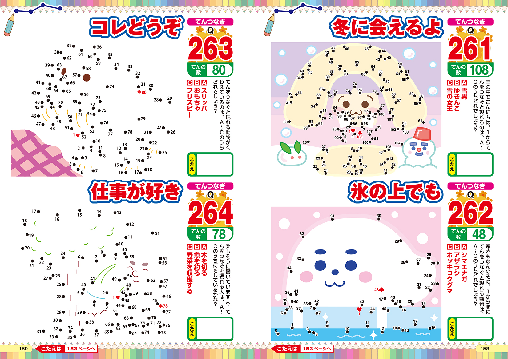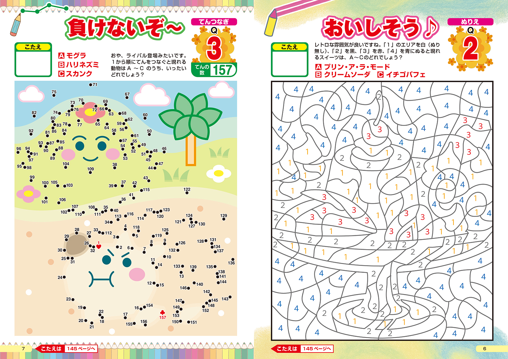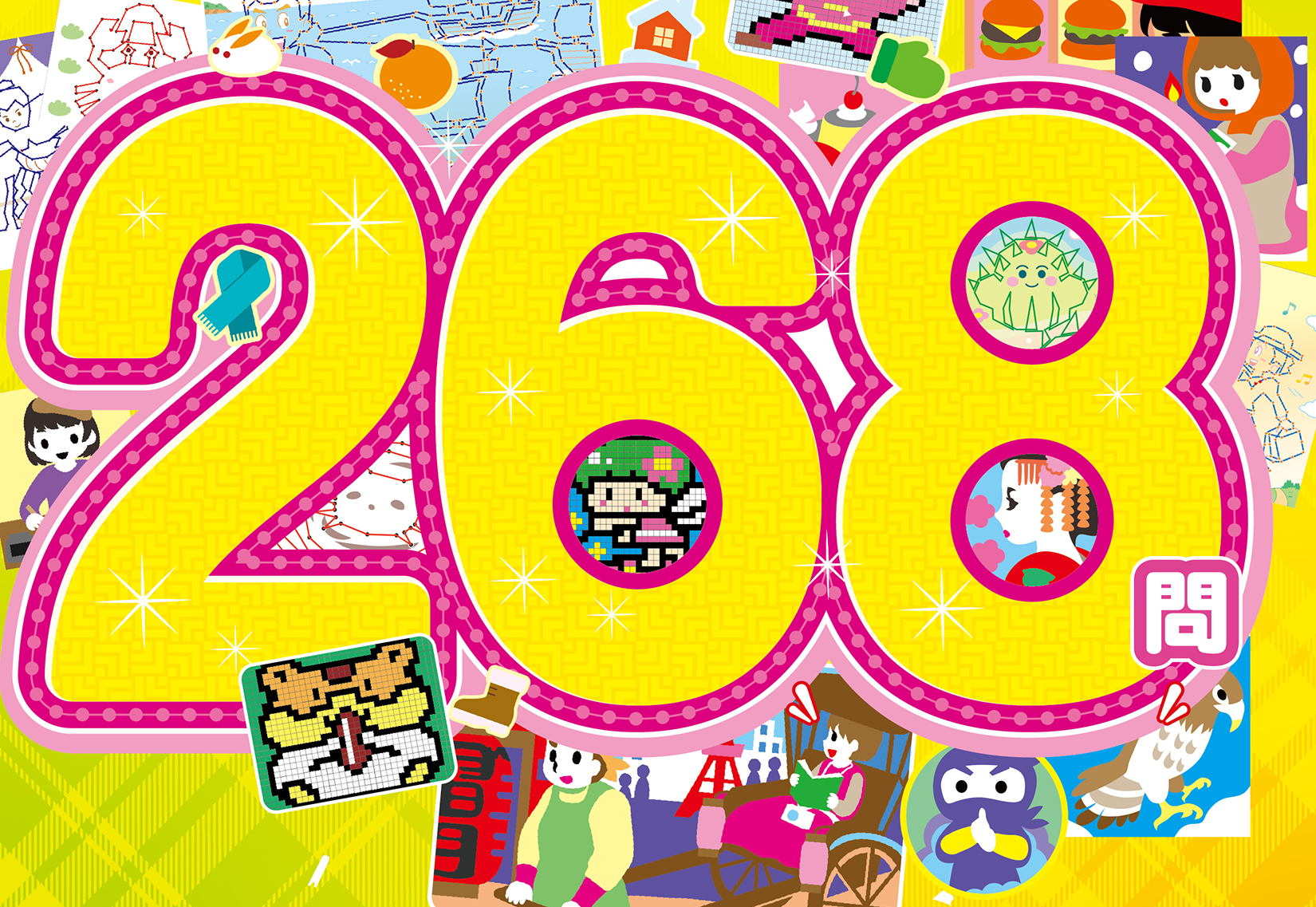 本誌は、そんな2種類のお絵描きパズルを268問も集めた、大ボリュームのパズル誌です。気軽に遊べるコンパクトな問題から、2ページ相当のてごわいジャンボ問題まで、多彩なサイズを取り揃えました。描かれるイラストも、かわいい動物や美しい風景など多彩ですから、年齢を問わずみんなで楽しめますよ。