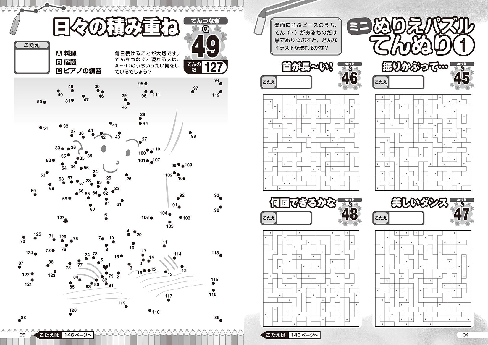 ●問題数がいっぱいだからといって、こぢんまりしたパズルばかりじゃありません。2ページ相当のジャンボてんつなぎもあるんです。